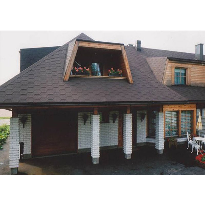 - гибкая черепица из коллекций Plano Tema, Plano Natur, Plano Claro, Plano Antik, Claro Antik предлагается в двух нарезках — прямоугольной и шестигранной, каждый гонт этого кровельного материала состоит из 6 слоев (полиэтиленовая пленка, клеевая полоса, мелкозернистая посыпка, модифицированный битум, стеклохолст и крупнозернистая посыпка);